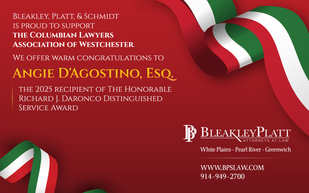 Bleakley Platt & Schmidt is proud to have sponsored and attended the Columbian Lawyers Association of Westchester’s Annual Gala at Glen Island last Friday. We congratulate Angie D’Agostino, Esq., Dean for Student & Campus Affairs at Elisabeth Haub School of Law at Pace University, on receiving The Honorable Richard J. Daronco Distinguished Service Award for her contributions to the study of law.